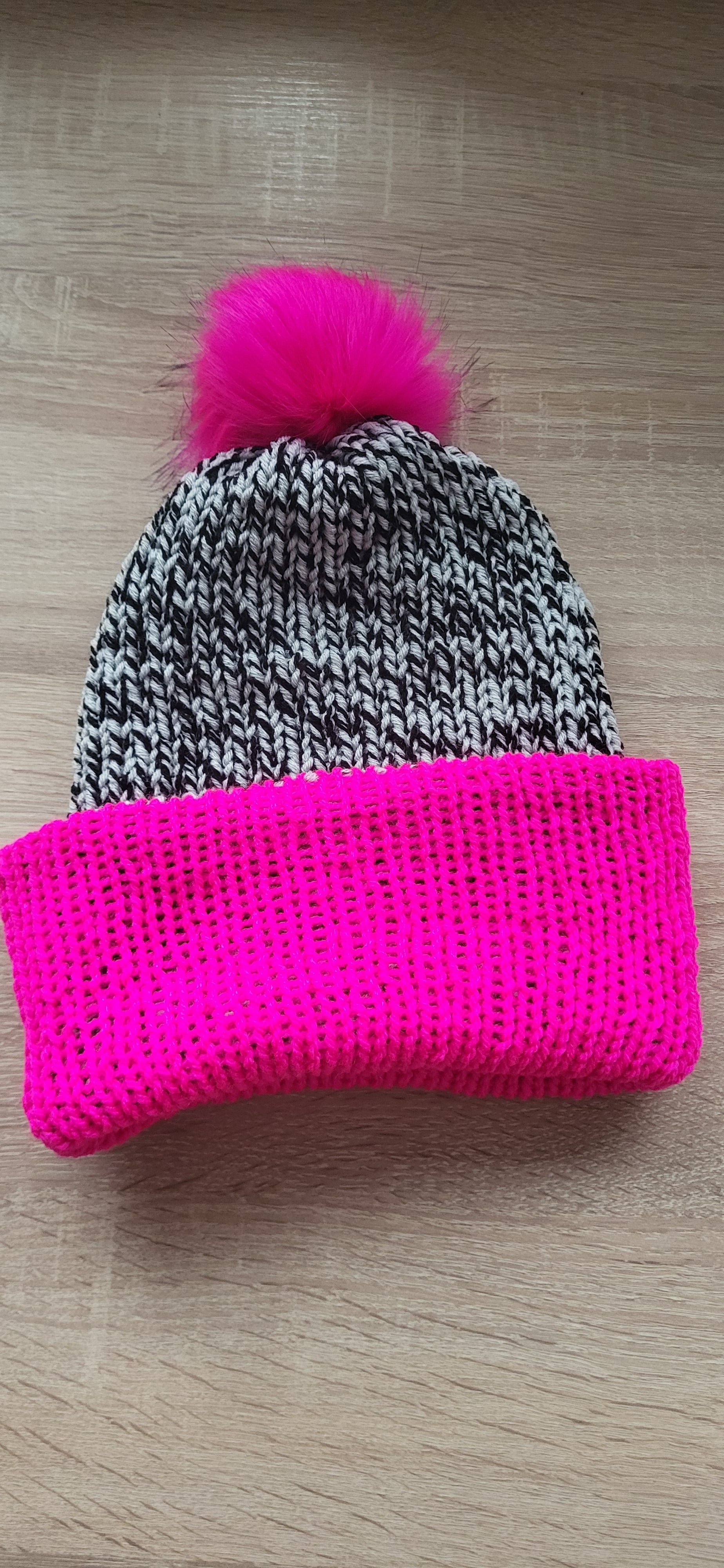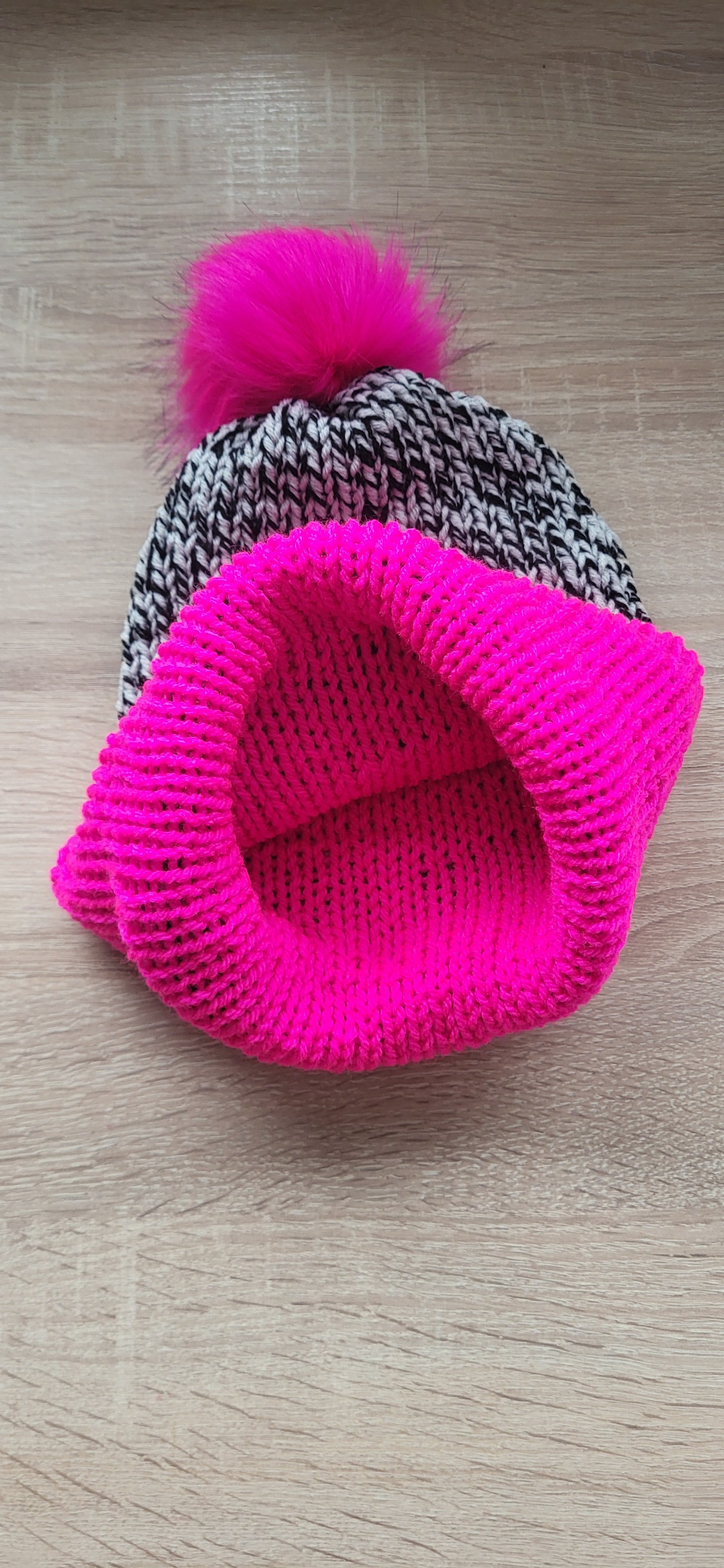Gestrickt in Schwarz, Weiß und Neonpink ist sie ein Hingucker. Der Bommel ist auch Pink.